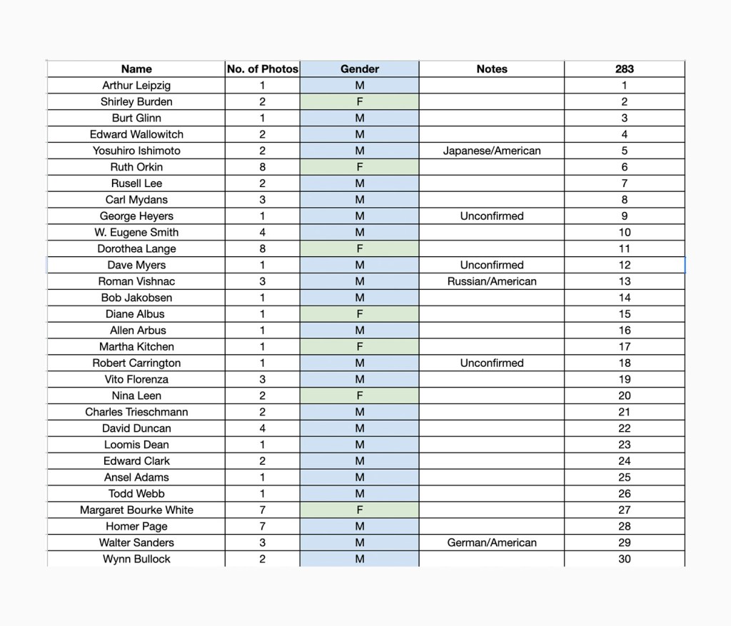Note: There was one photograph that was credited to Diane and Allan Arbus. I counted them as two separate individuals (one male, one female).