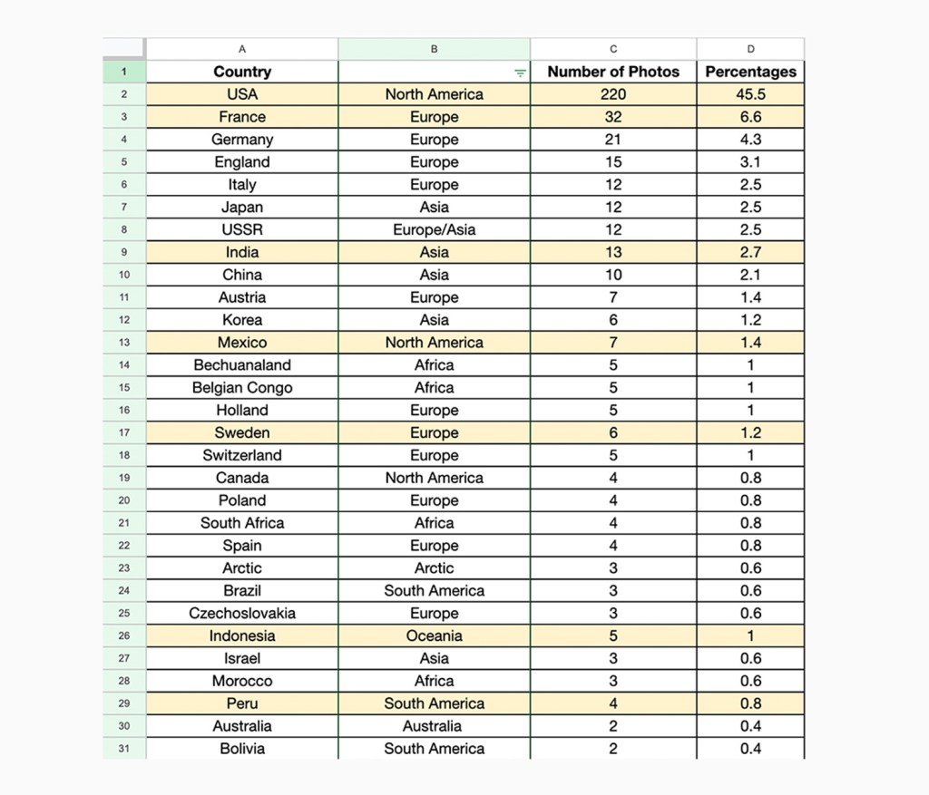 The image is a screenshot of a section of the photos by geography spreadsheet.