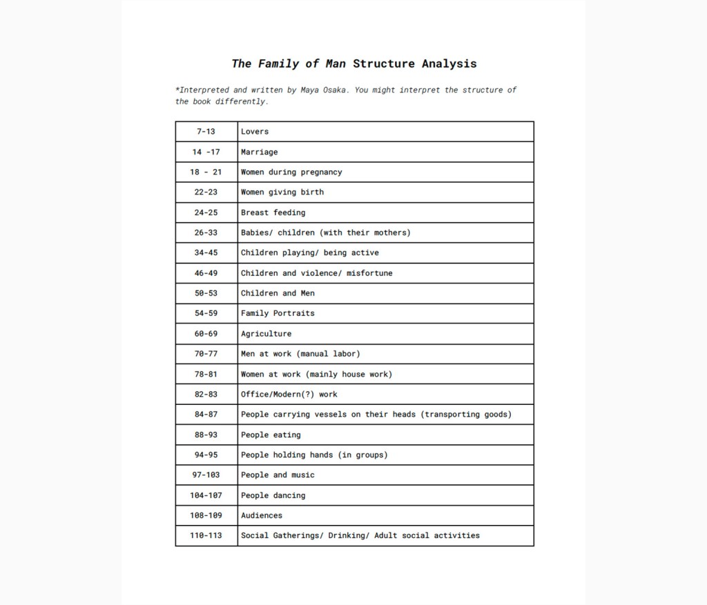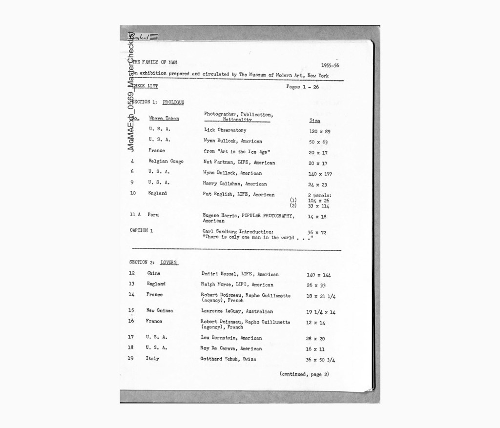 The introduction in the book explains that the exhibition was “conceived as a mirror of the universal elements and emotions in the everydayness of life—as a mirror of the essential oneness of mankind throughout the world.”