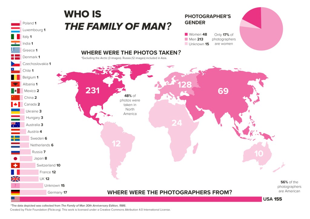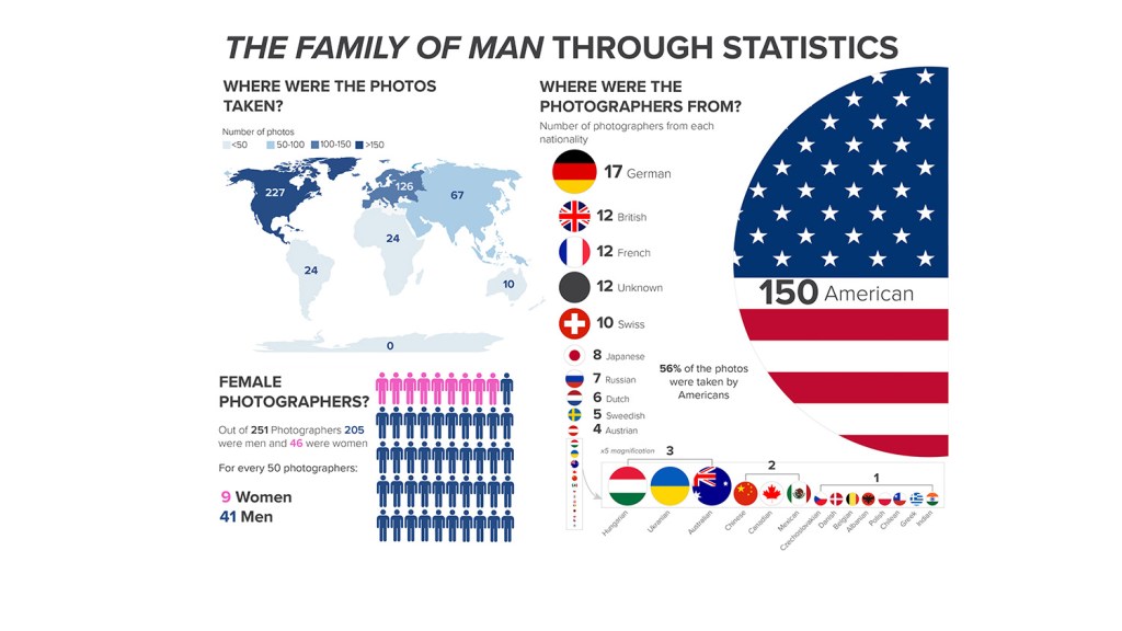 Out of 484 images depicted in The Family of Man 30th Anniversary Edition (1986), 220 are from the USA. That’s 46% of all the photos. The most heavily featured countries after America were: France (32 images), Germany (21 images) and England (15 images). All in Europe. Compared to America’s 46%, France, the runner up, makes up only 7% of the total number of images.