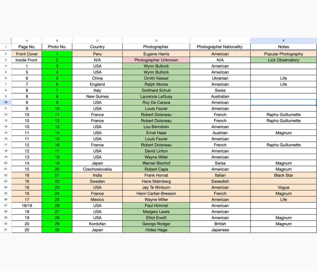 This shows where they appear in the book, the country depicted, the photographer and which organization the image is associated with or was made for. From this ‘master’ spreadsheet I compiled three more views:
