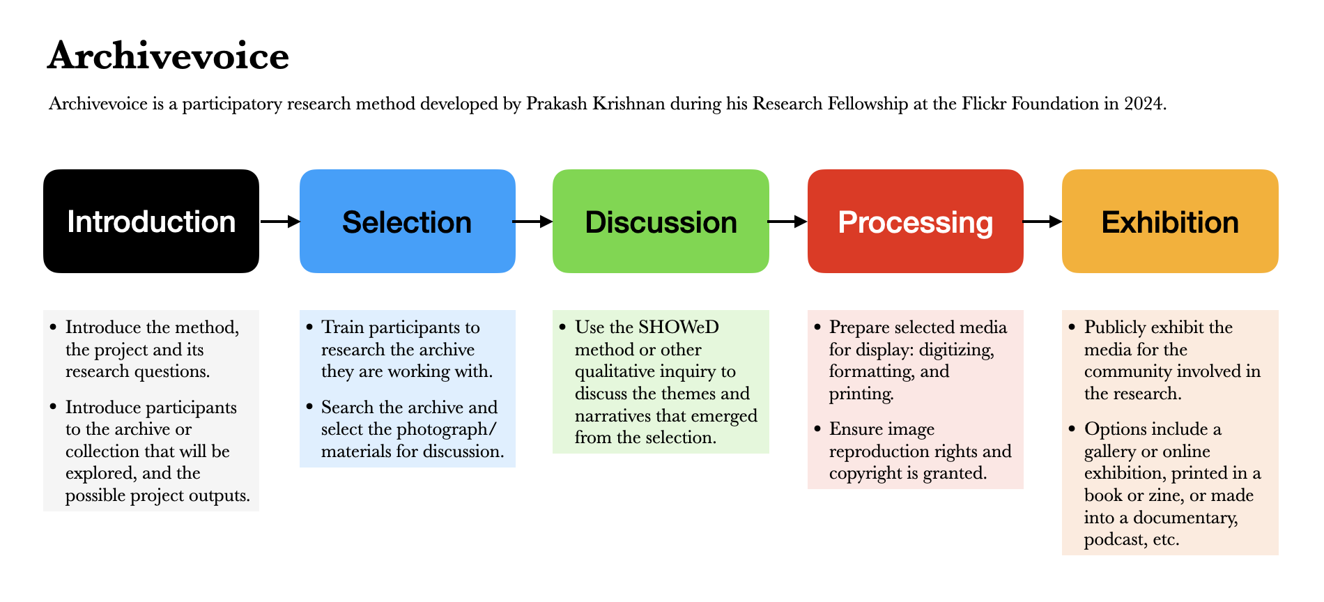 Archivevoice is a Participatory Action Research (PAR) method that adapts the core principles of Photovoice using photographs or other archival documentation to undergo community-centered research.
