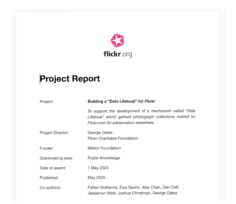 In 2024, the Flickr Foundation was funded by the Mellon Foundation to conduct co-design workshops about Data Lifeboat, and the concept of a Safe Harbor Network with peers from within cultural institutions, technologists, and academics.