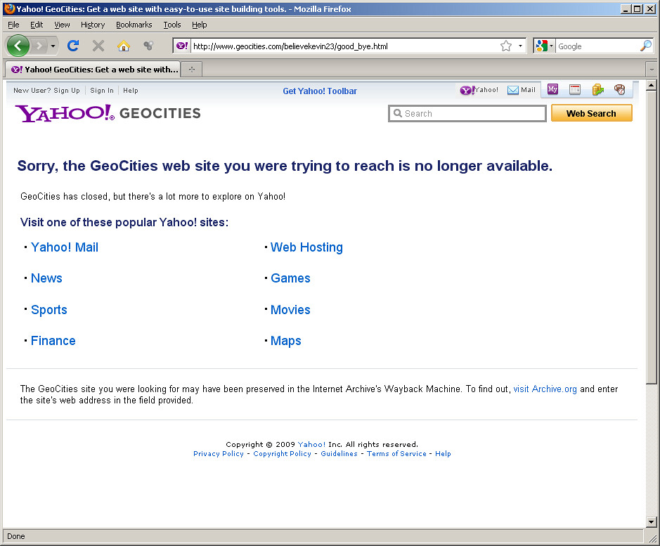 Wanting to rebuild Geocities in the present is an example of restorative nostalgia, while looking through the Geocities archive can offer a chance to reflect. When the platform was shut down in 2009 by Yahoo, it was partially archived due to the emergency preservation work of the Archive Team, a collective of volunteer archivists who acted to download as much of Geocities as possible before it went offline. Because of this voluntary labour by people who were passionate about saving web history, an archive of about one terabyte of Geocities data is now publicly available for free download today at the Archive Team’s website.